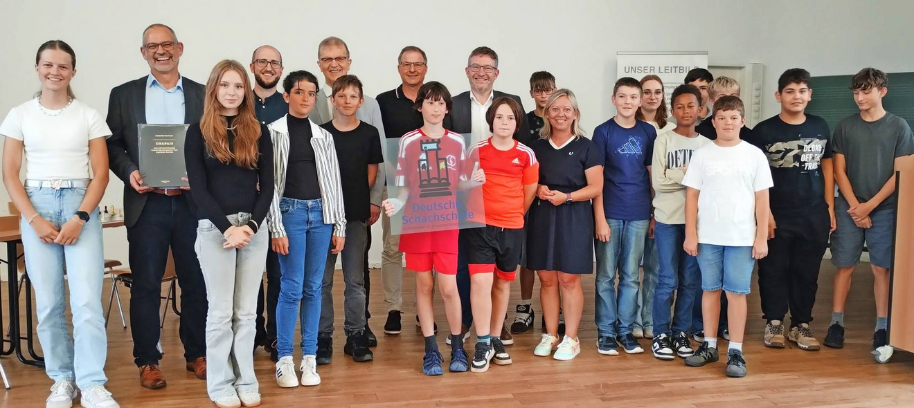 Foto: Yannick Beining (Gymnasium Ottweiler), Romy, Gagliardi, Simone Krämer (Sparkasse Neunkirchen), Mark Hubertus (Schulleiter)