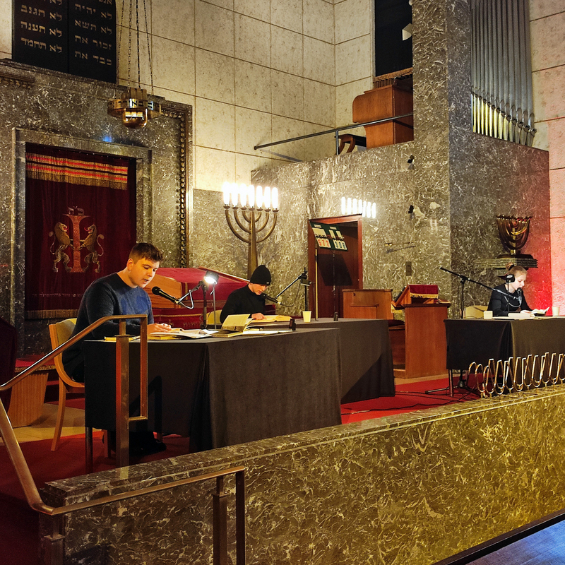 Bei der Klangstele lesen Lektorinnen und Lektoren an drei Tischen aus verschiedenen historischen Texten, darunter aus dem Kalendarium der Ereignisse im Konzentrationslager Auschwitz-Birkenau von 1939 bis 1945. Gleichzeitig erklingen in stündlichen Wiederholungen Werke von Luigi Nono und Arvo Pärt, die sich musikalisch mit dem Holocaust auseinandersetzen. Die Verbindung dieser drei Klang- und Textebenen erzeugt eine dichte, nachdenklich stimmende Atmosphäre.