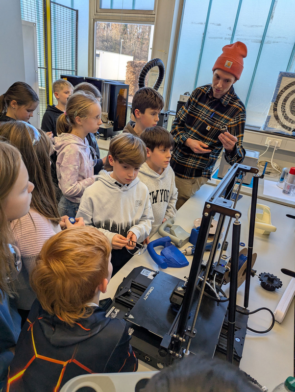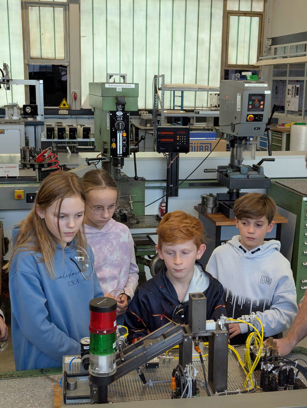 Der Besuch startete um 12:30 Uhr mit einer herzlichen Begrüßung durch Geschäftsführer Thomas Kolb. Anschließend ging es in zwei Gruppen durch verschiedene Stationen des Unternehmens. Dabei erfuhren die Schüler, wie vielfältig und faszinierend Technik im realen Einsatz sein kann. Highlights waren die Arbeit an einer Drehbank, bei der die Kinder hautnah zusehen konnten, wie aus einem Rohling ein fertiger Kreisel wurde. Ebenso beeindruckend war die Biegemaschine, an der die Schülerinnen und Schüler einen eigenen Handyhalter biegen konnten.